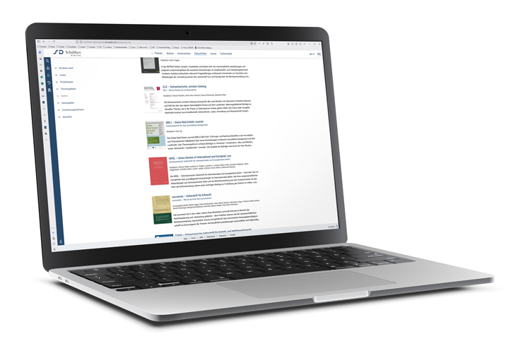 Im Print-Abonnement haben Sie automatisch einen Zugang zur Digitalausgabe Ihrer Zeitschrift auf Schulthess Digital inkludiert. Lesen Sie auf Wunsch monatlich die digitale Ausgabe der SJZ im Web- oder im gewohnten Printlayout noch vor dem regulären Erscheinungstermin des gedruckten Heftes. Recherchieren Sie komfortabel mithilfe einer ausgefeilten Suchtechnologie und sparen Sie wertvolle Zeit beim Finden aktueller und zurückliegender SJZ-Beiträge. Ihre abonnierte Zeitschrift wird Ihnen neben weiteren Publikationen in Ihrer persönlichen digitalen Handbibliothek bereitgestellt, damit Sie Ihre Werke für die tägliche Arbeit jederzeit griffbereit haben.